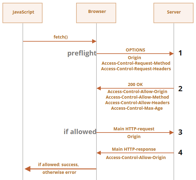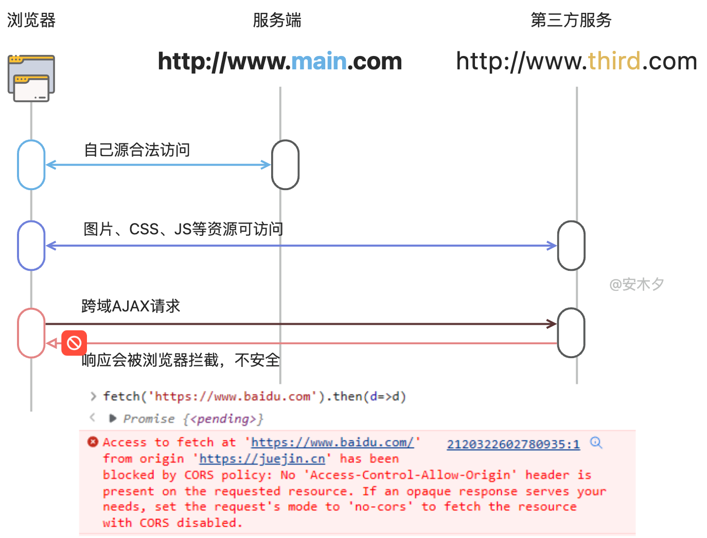 - 浏览器收到响应后会检查“Access-Control-Allow-Origin”,和当前源对比,如果不合法则会报错——跨域。