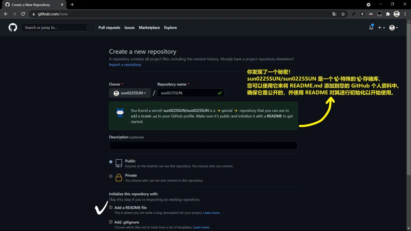 其实DIY Github 的首页很简单,我们只需要新建一个仓库名和自己 Github 用户名相同的仓库并且添加一个 README.md自述文件即可。