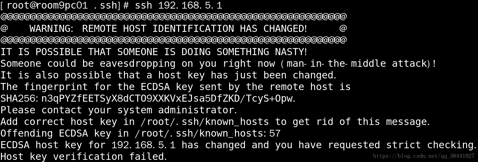 报错的大概意思是192.168.5.1的ECDSA主机密钥已更改,并且您已请求严格检查,远程主机发送的ECDSA密钥指纹信息是和本机的密钥指纹信息不一致