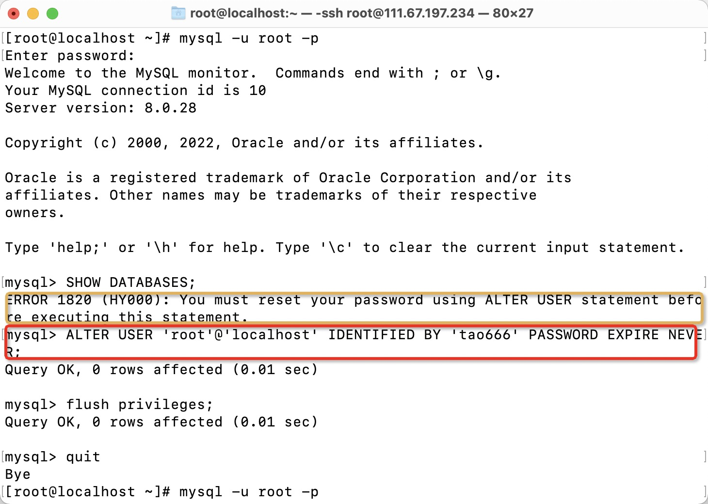 grep ‘password’ /var/log/mysqld.log head -n 1 // 找临时密码