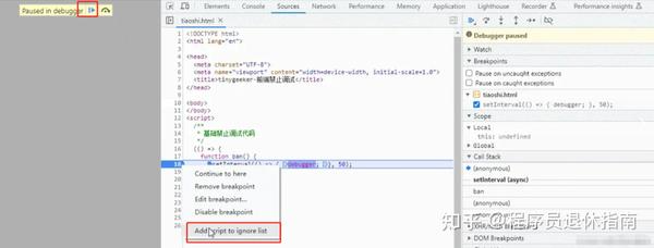 通过添加 add script ignore list 需要忽略执行代码行或文件,也可以达到禁止无限 debugger,忽略执行的代码。