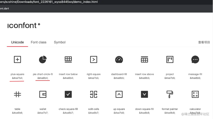 其中fontFamily的值’IconFont’就是我们刚才在pubspec.yaml中声明的新字体,但是代码中的0xe7b4是指什么呢?回到之前下载解压zip包的文件夹,双击demo_index.html文件在浏览器中打开后,我们可以看到下面的画面