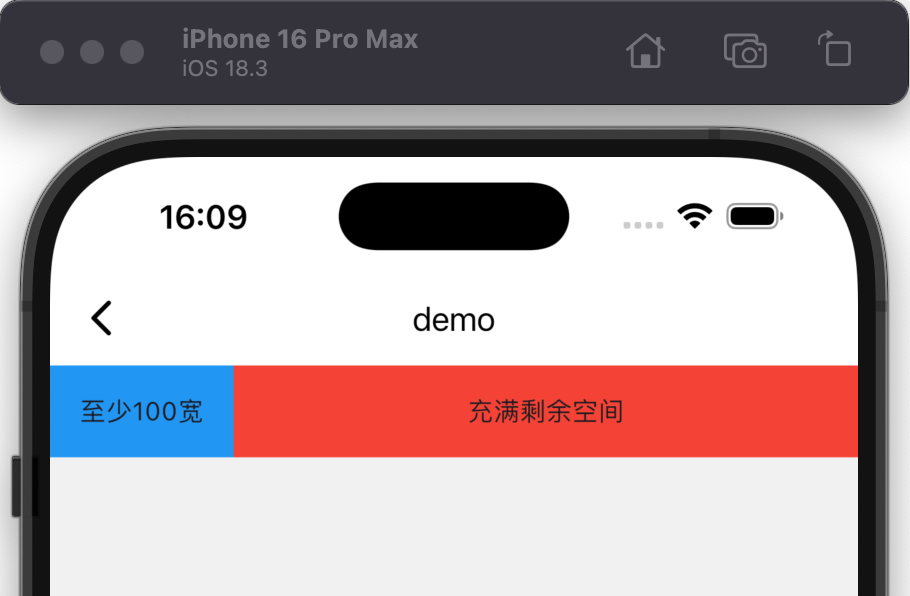 预期效果:\ 一行两个盒子,左边蓝色盒子宽度至少100(可能更大),右边红色盒子占据剩余所有空间。