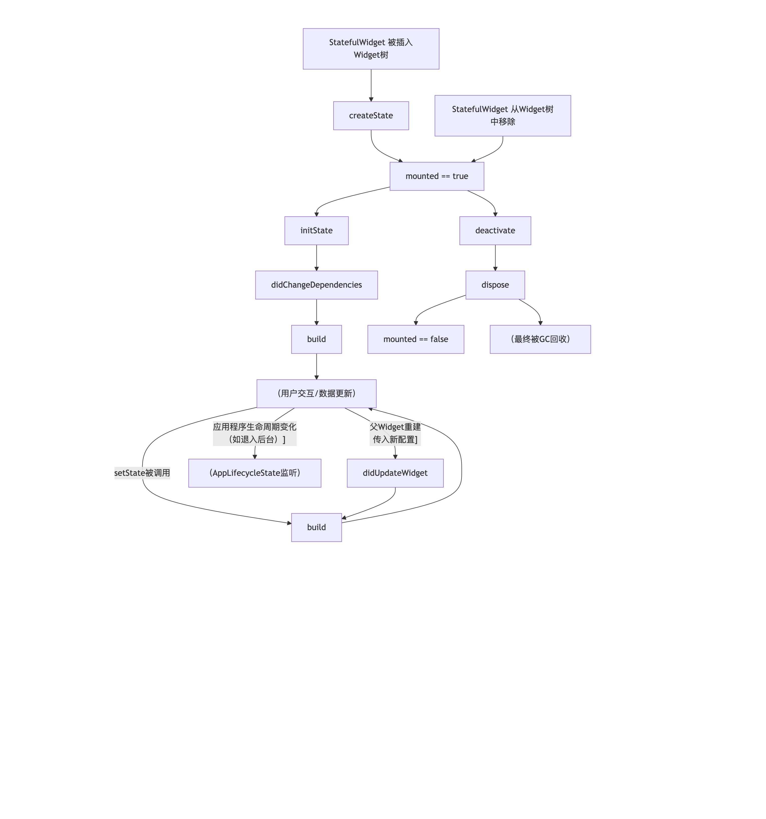 StatefulWidget 的生命周期围绕 State 类展开。下图清晰地展示了其完整流程: