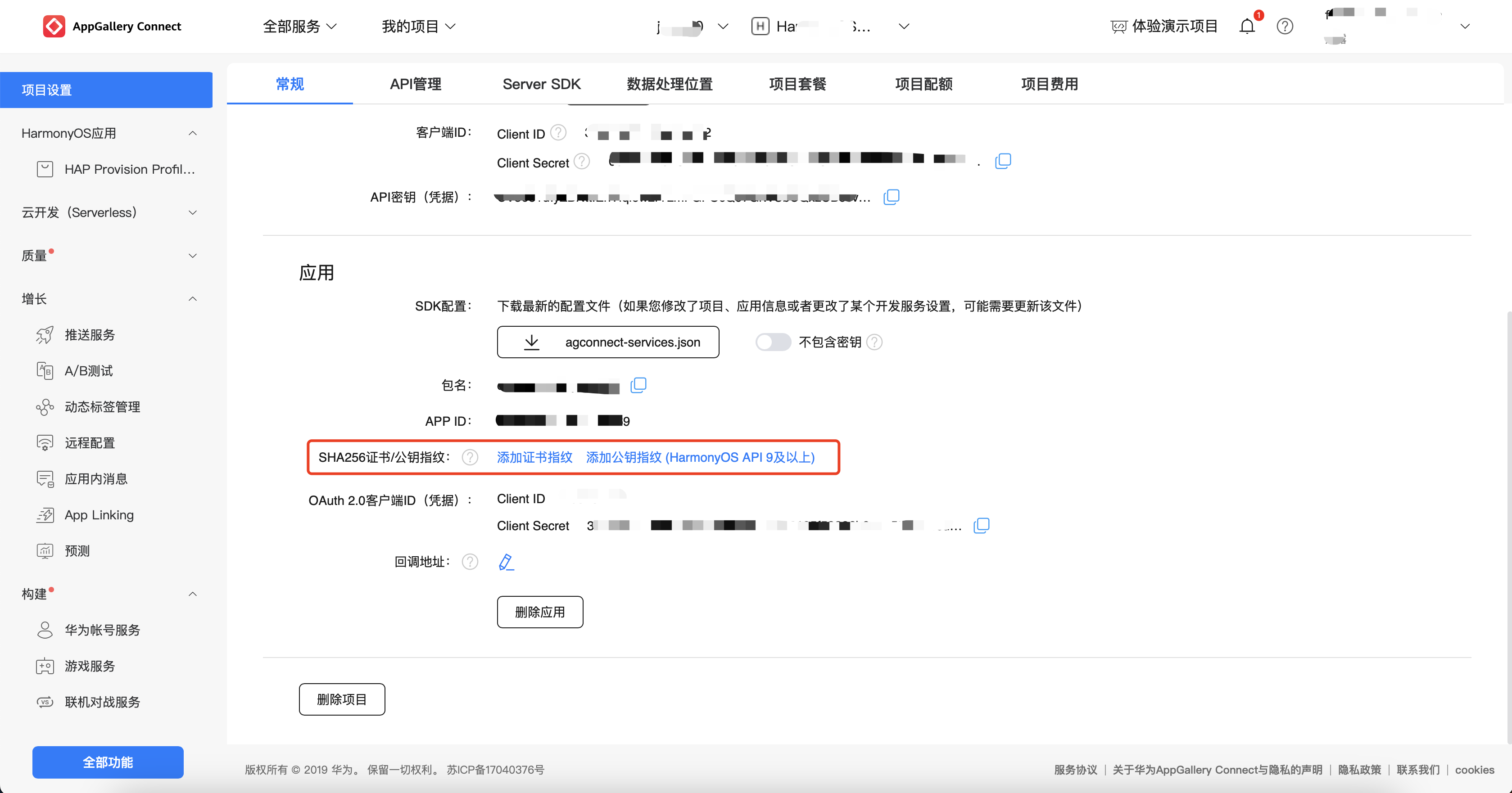 特别注意,鸿蒙应用创建完成后,您一定要记得配置应用「SHA256证书/公钥指纹」:点击“SHA256证书/公钥指纹”后的“添加公钥指纹(HarmonyOS API 9及以上)”,按照如下文描述「配置签署」。