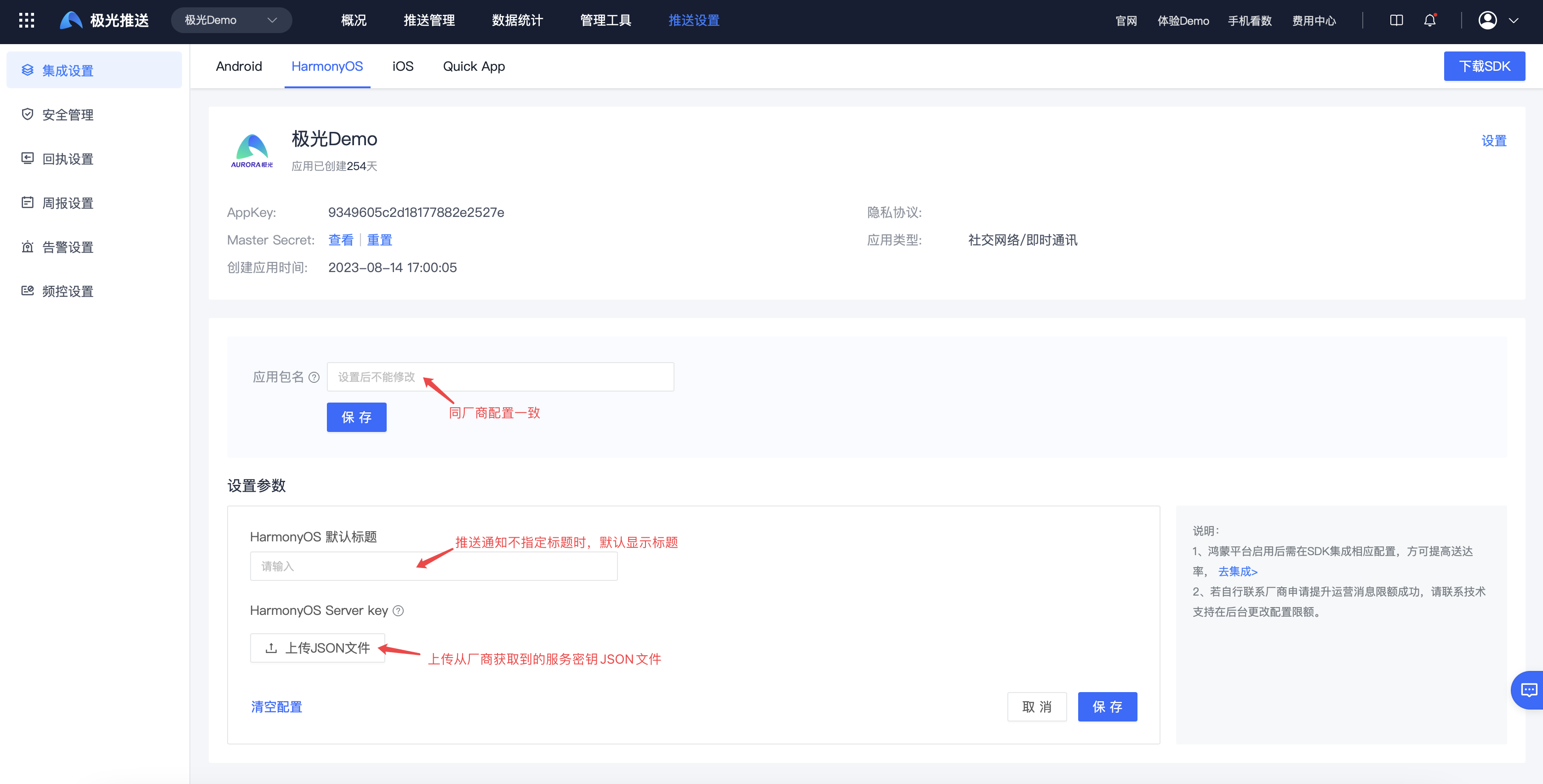 想要推送功能,需要配置 HarmonyOS 平台信息