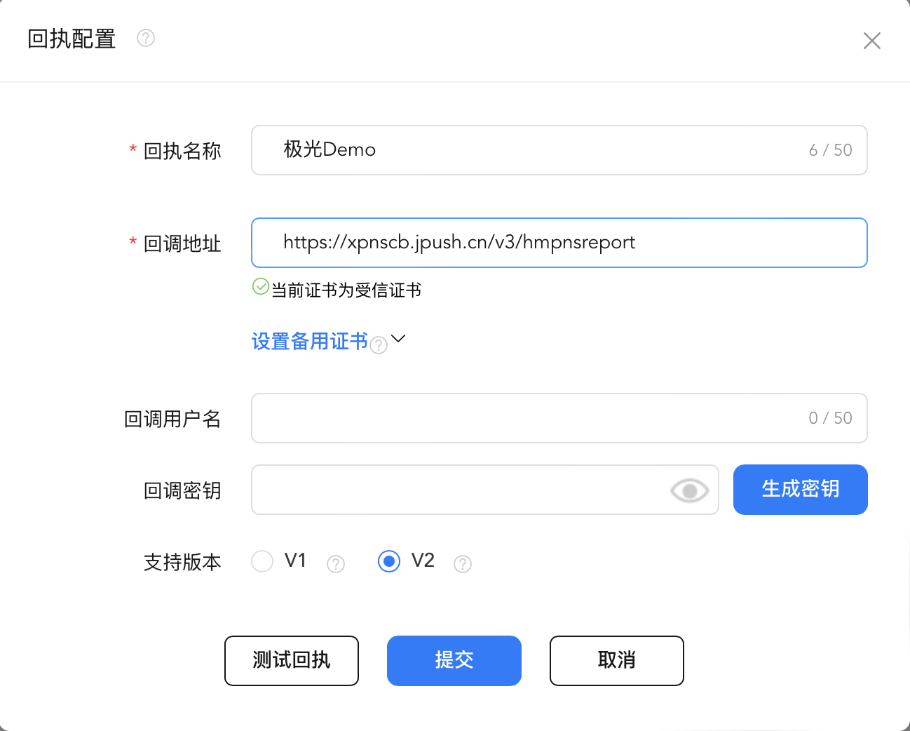 https://xpnscb.jpush.cn/v3/hmpnsreport - 支持版本:请一定选择华为 V2 版本。