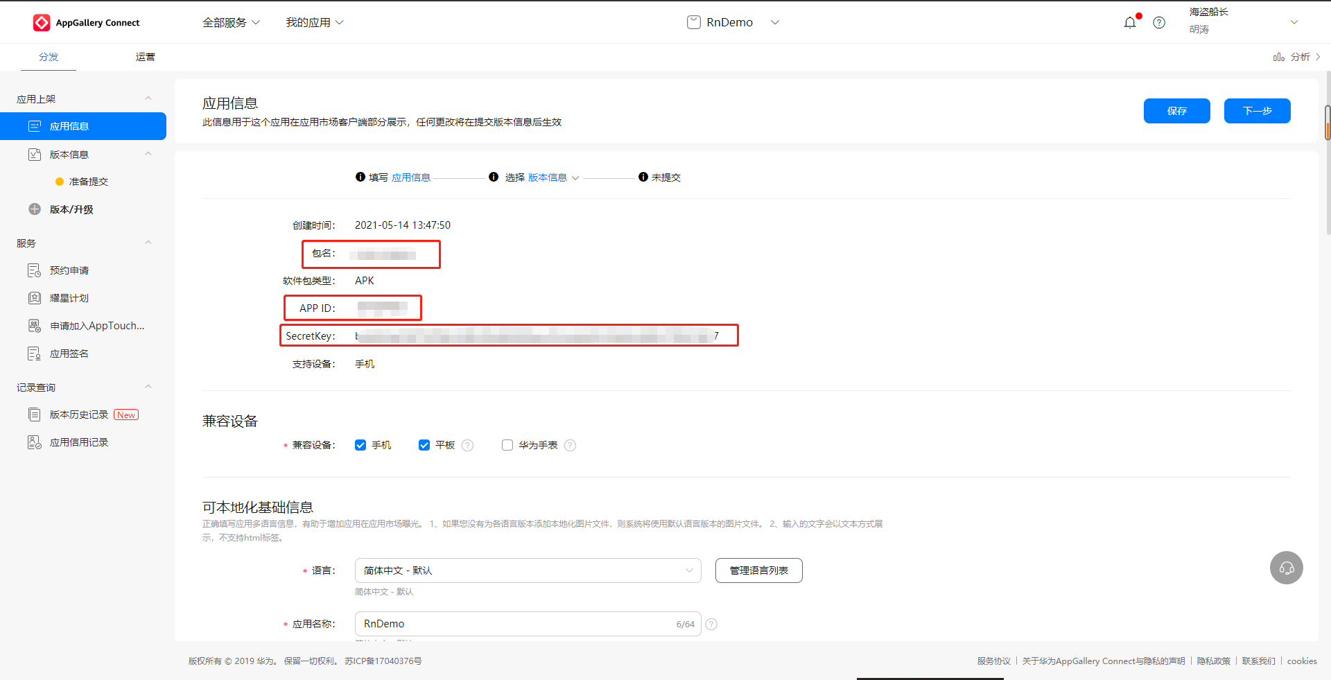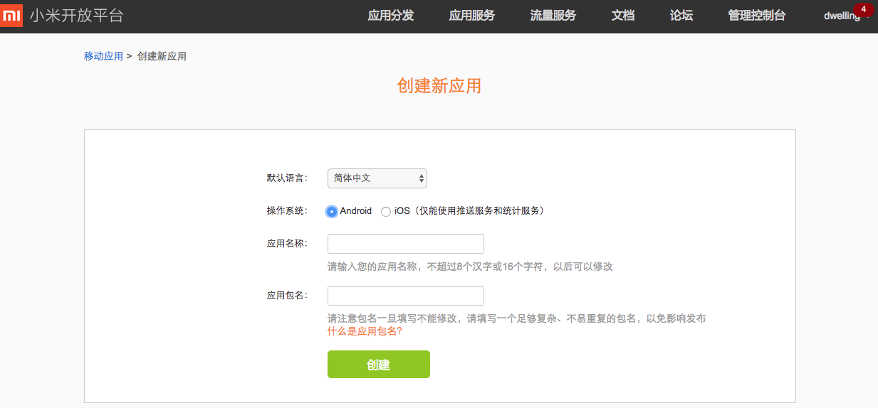 - 填写应用名称和应用包名创建应用