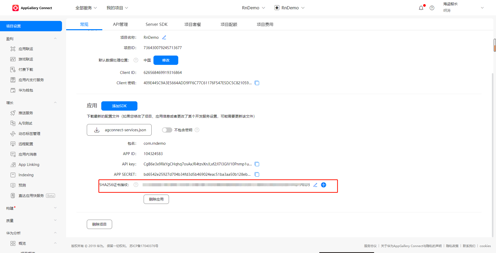 华为平台上【我的项目】-【项目配置】-【常规】中要填写[SHA256证书指纹],切记一定要点击右侧对勾保存。