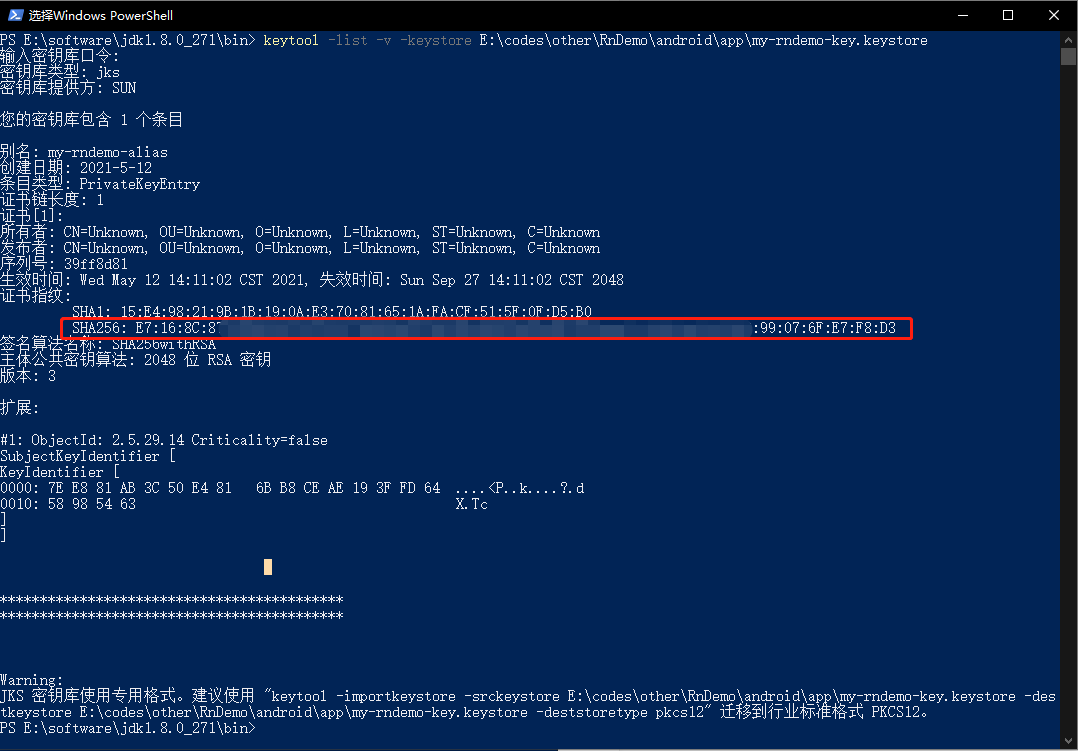 keytool -list -v -keystore E:\codes\RnDemo\android\app\test.keystore
