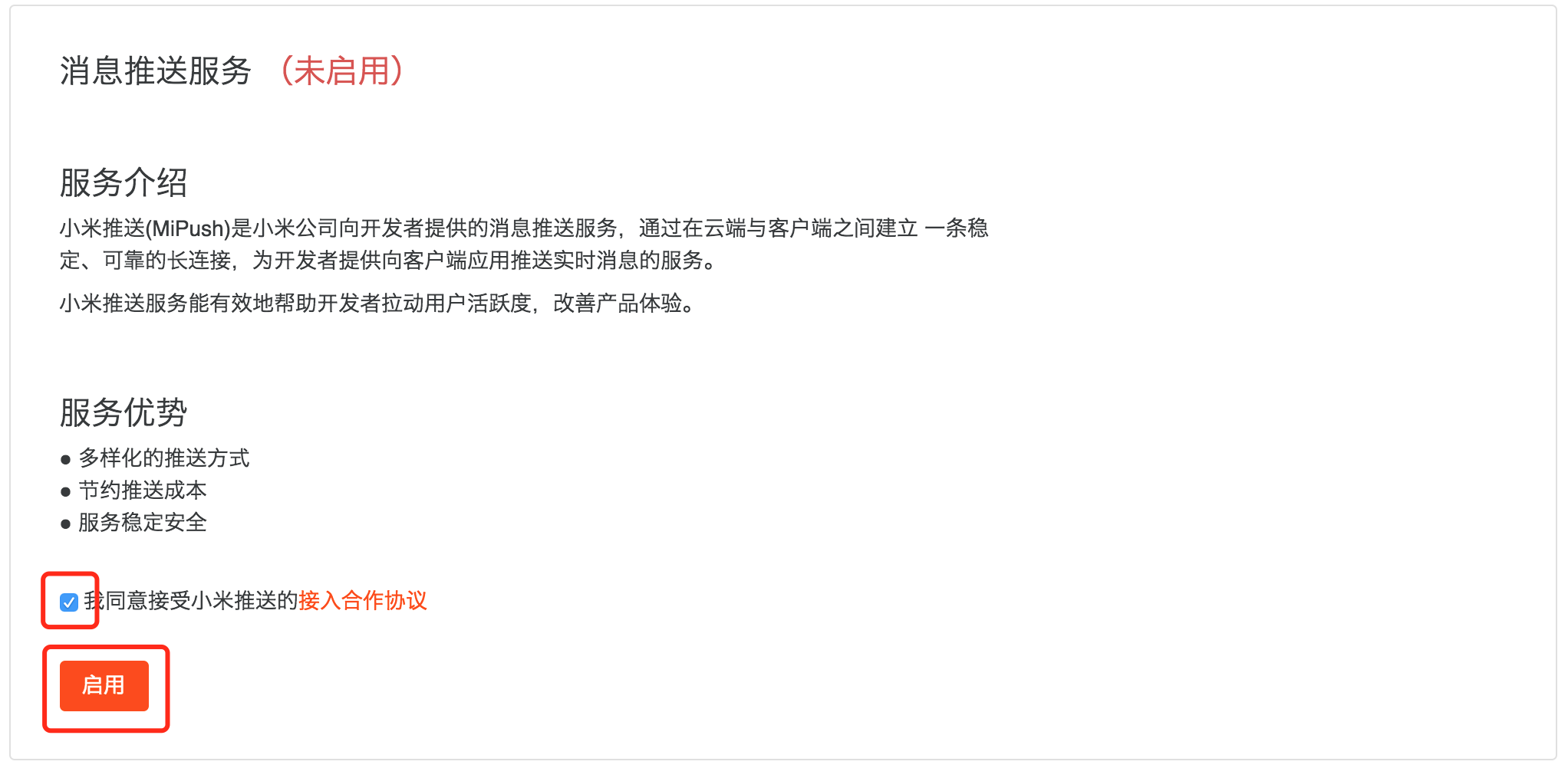 - 勾选我同意接受小米推送的接入合作协议复选框,点击启用按钮: