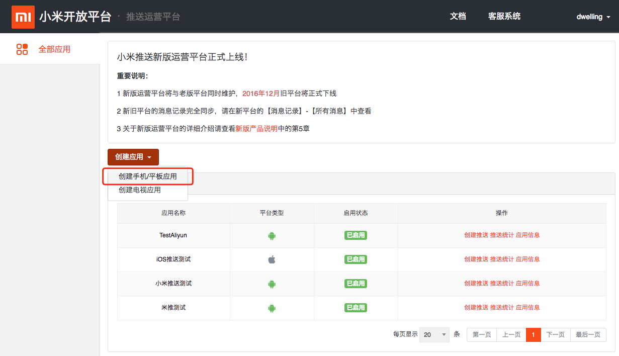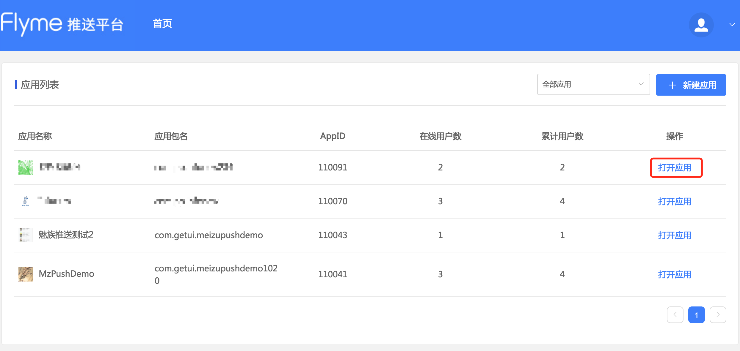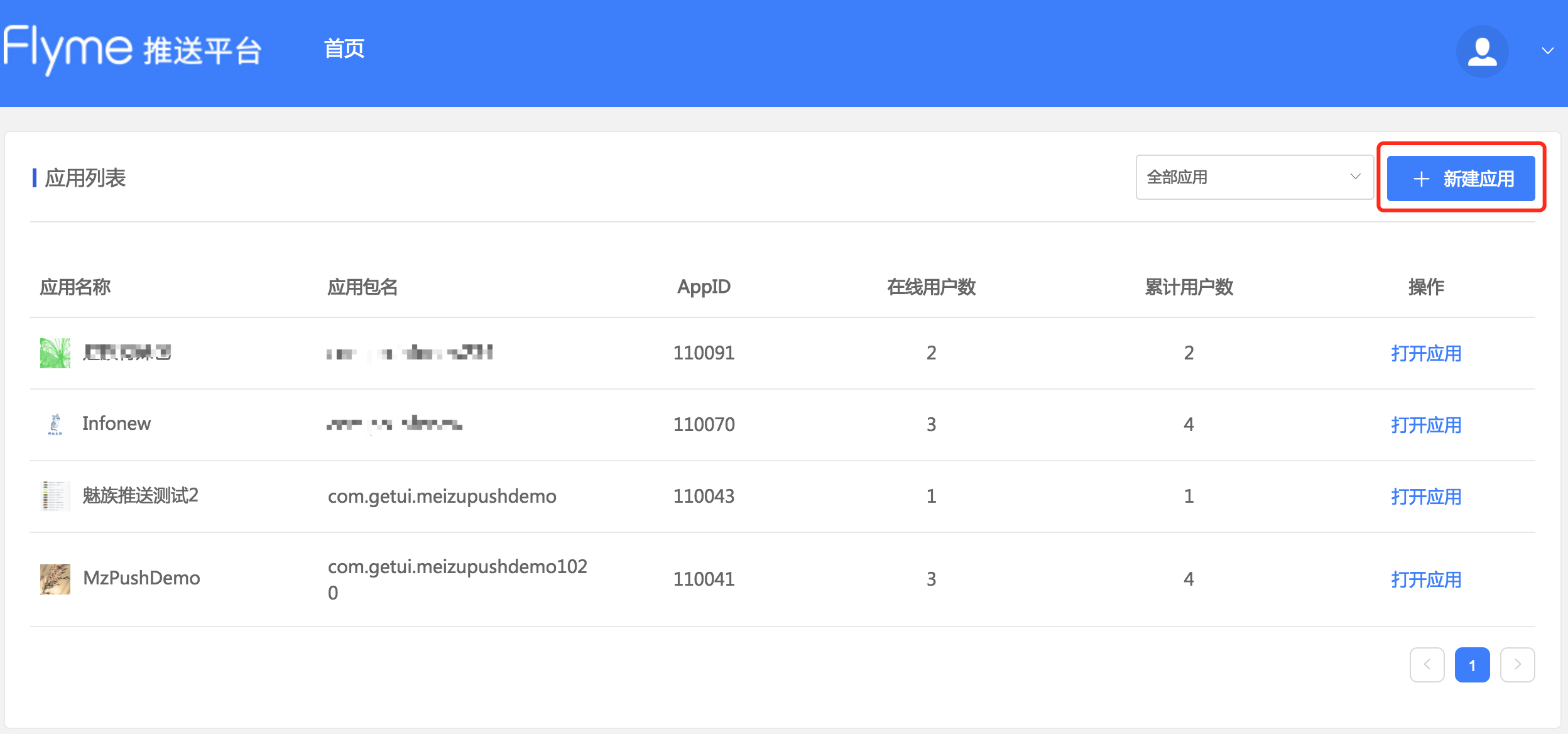 - 登录魅族推送平台,选择新建应用: