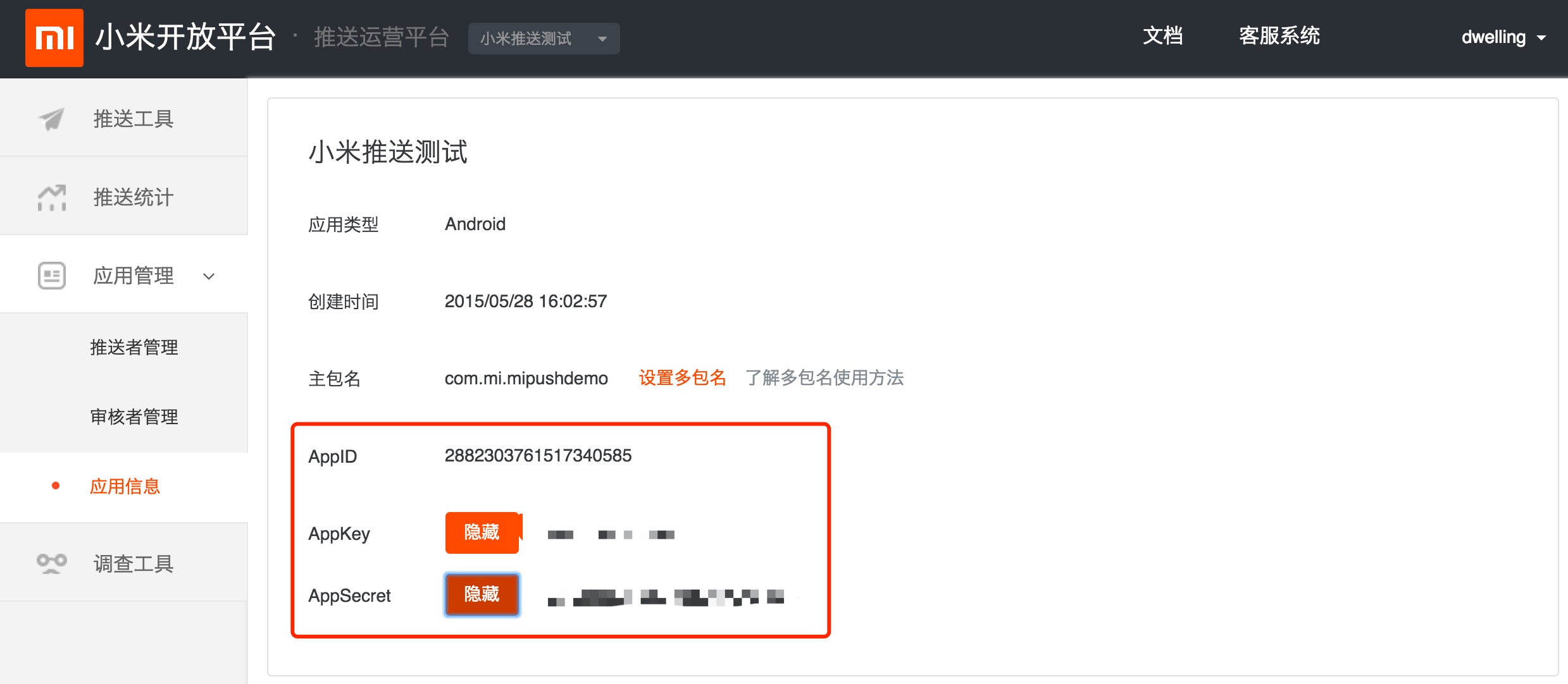 - 查看应用信息,获取小米 AppID、小米 AppKey、小米 AppSecret: