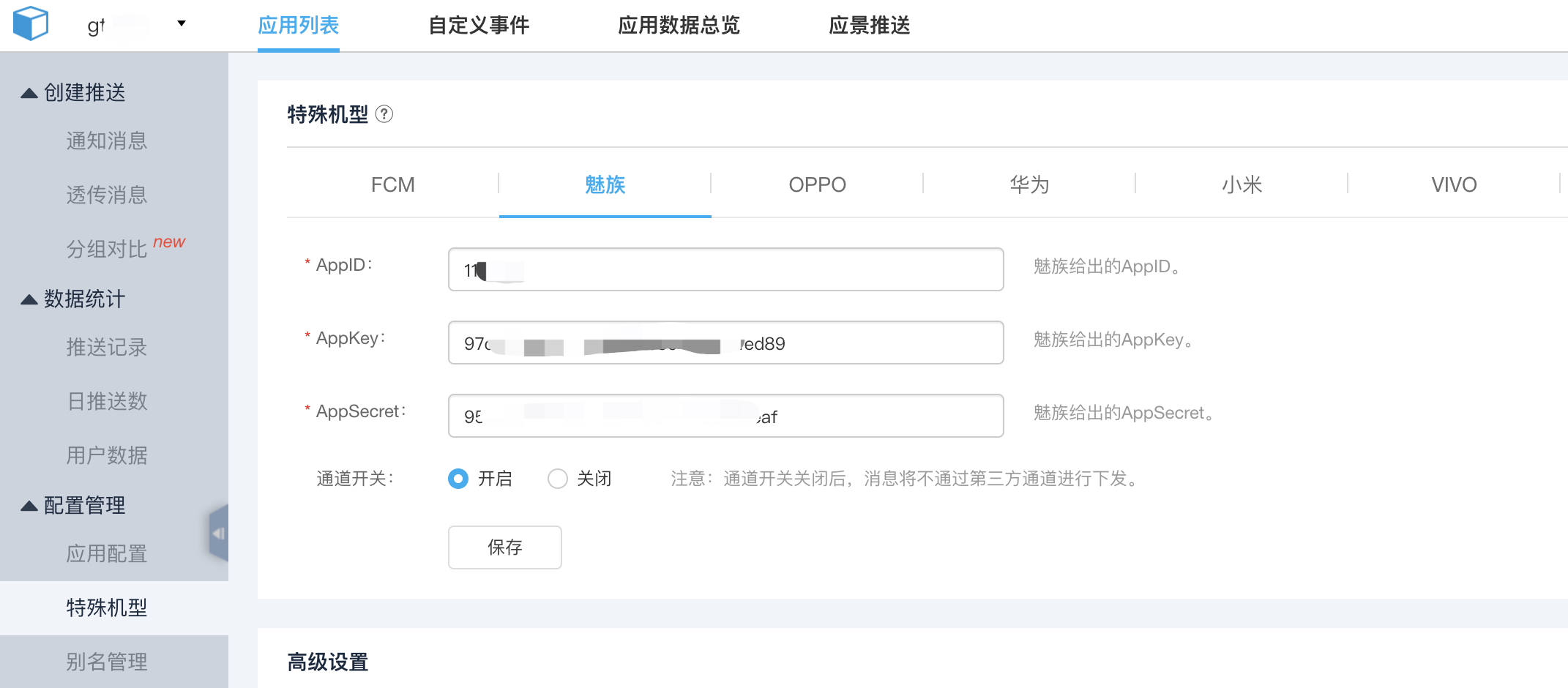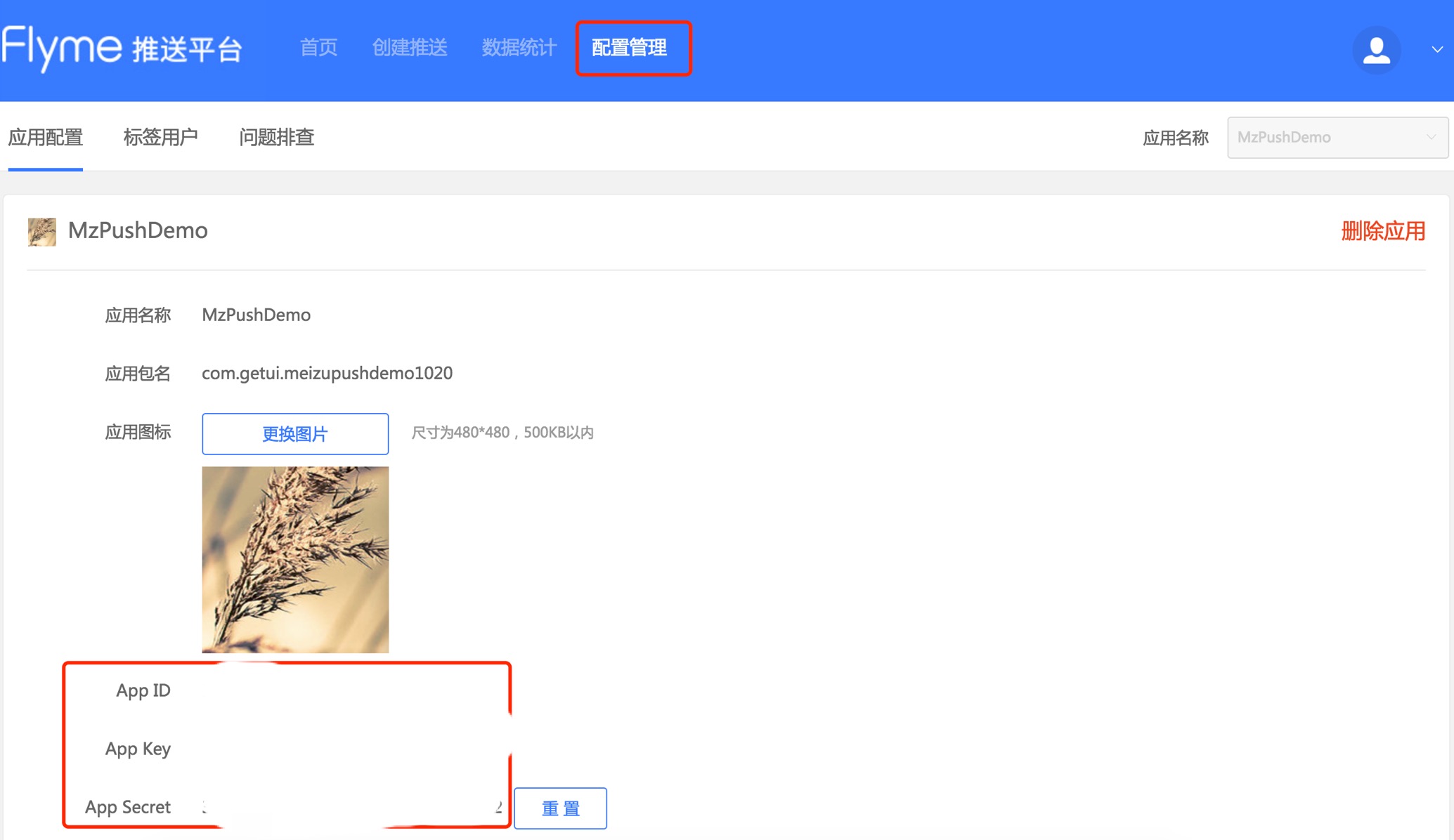 - 在配置管理中查看相应的魅族 AppID、魅族 AppKey、魅族 AppSecret: