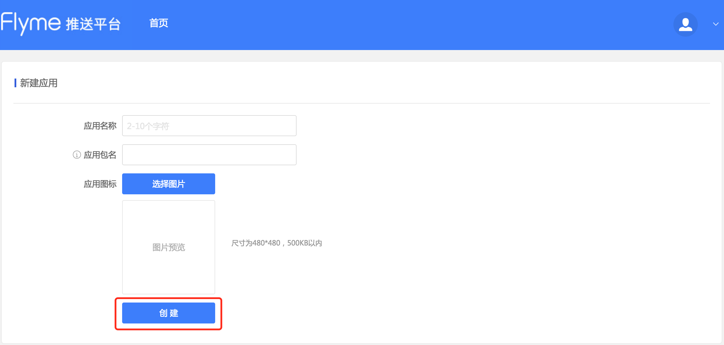 - 填写应用名称和应用包名,上传应用图标后创建应用: