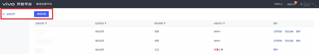 当开发者已经创建应用后,无论应用审核通过与否均可申请push服务。在登录vivo开发者账号后,申请push服务有以下三种方式