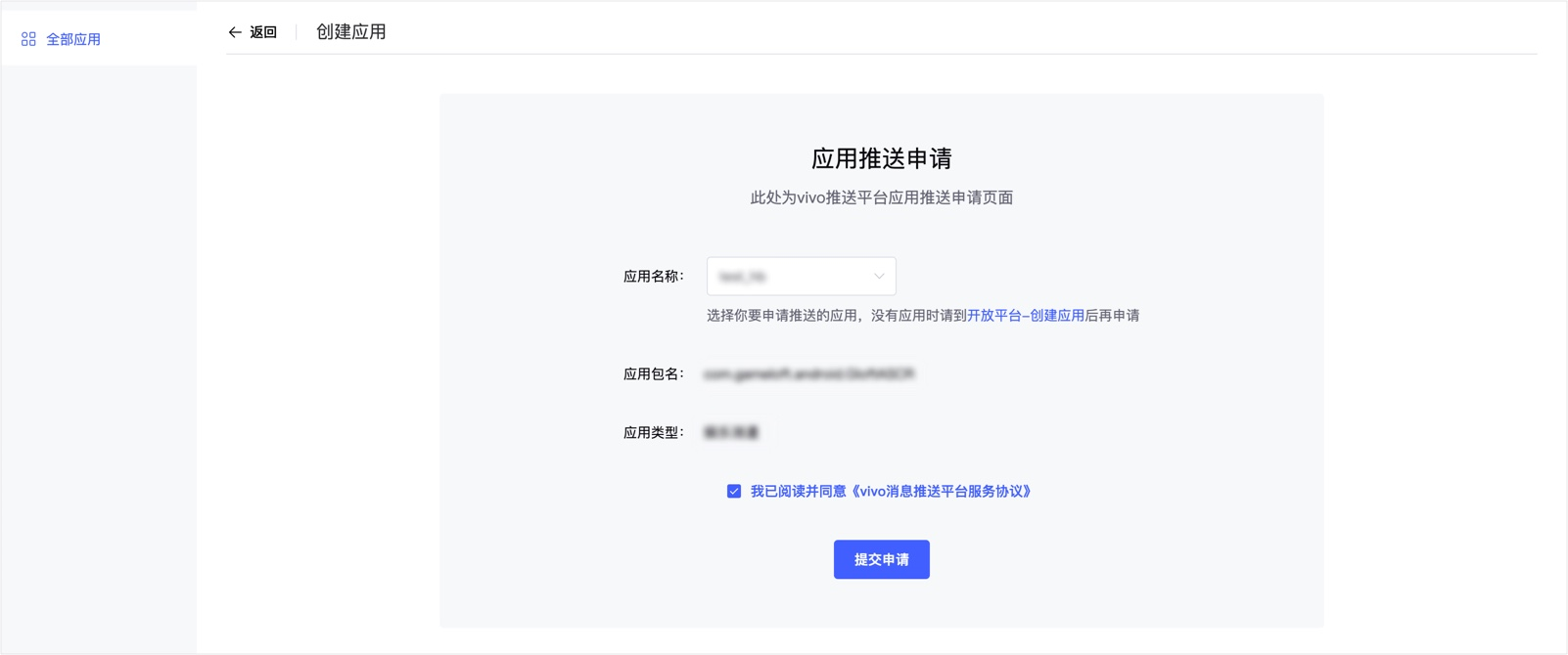 点击进入消息推送后,将会进入vivo开放平台-推送运营平台,在“消息推送-全部应用”中点击“创建应用”,若此操作在开发者创建应用后,所创建应用将会列入在应用名称里,点击“应用名称”选择要申请的应用后点击“提交申请”