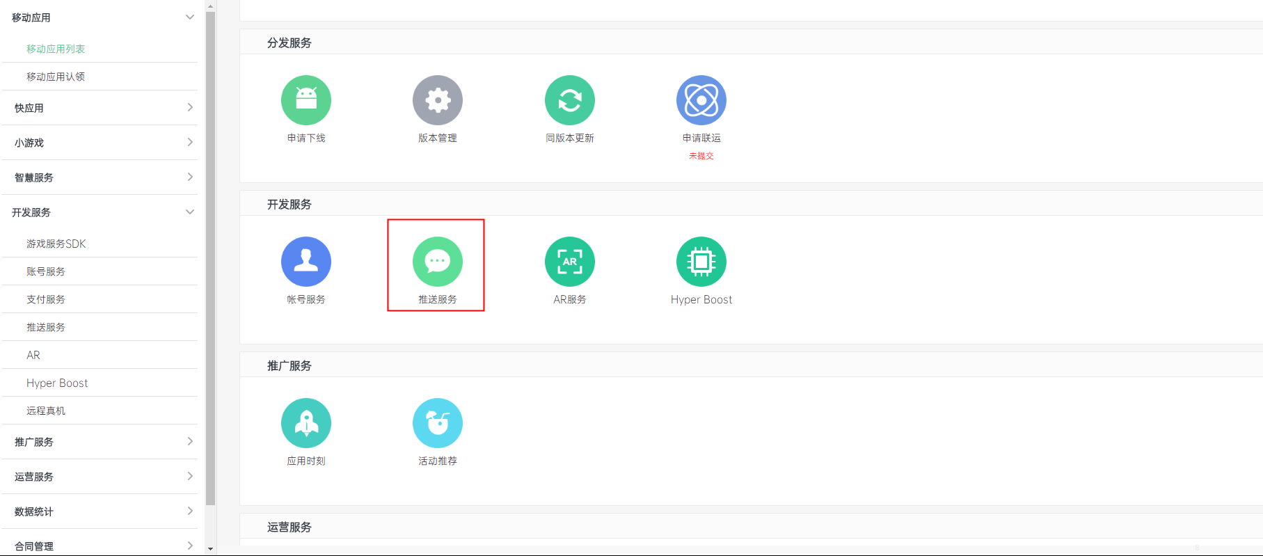 在未开启服务中点击需要申请push权限的应用,进入PUSH服务并点击申请开通。