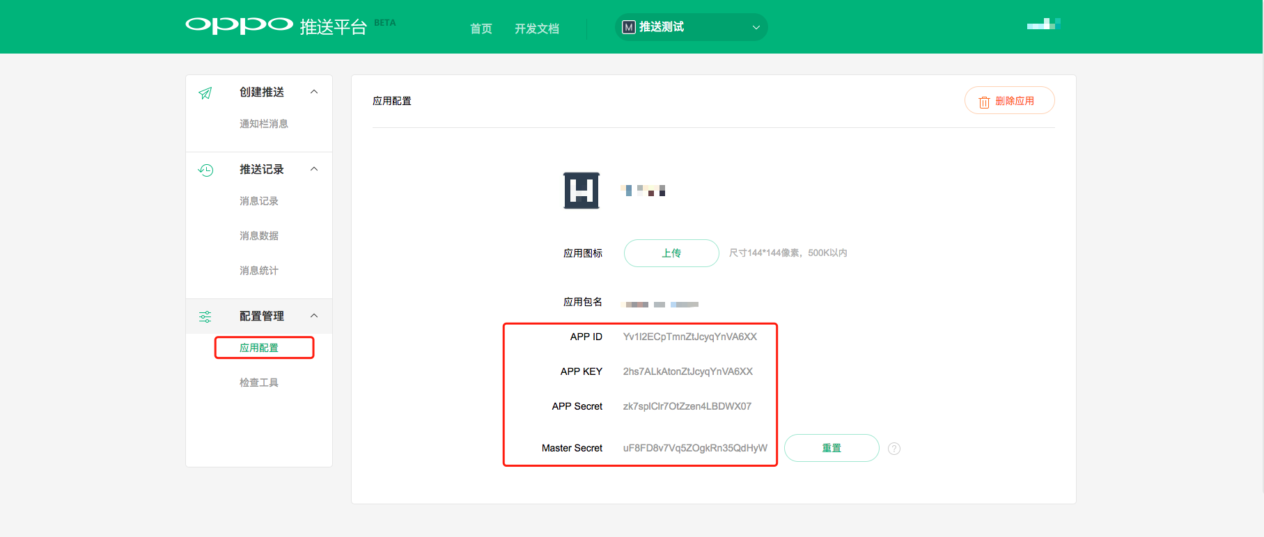 - 查看应用信息,获取 OPPO App ID、OPPO App Key、OPPO App Secret、OPPO Master Secret