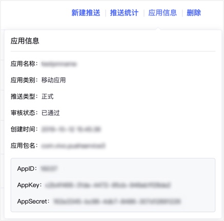 审核通过后即可使用平台返回的App key及App secret进行SDK的集成,使用推送服务。