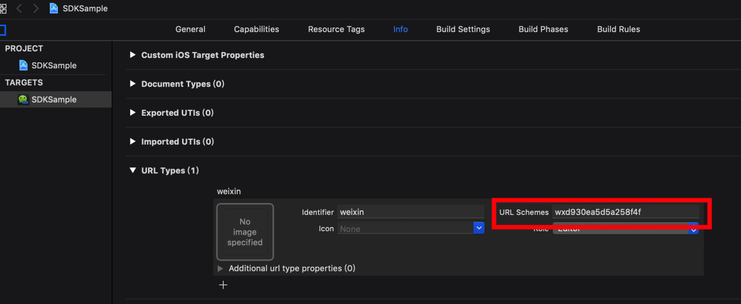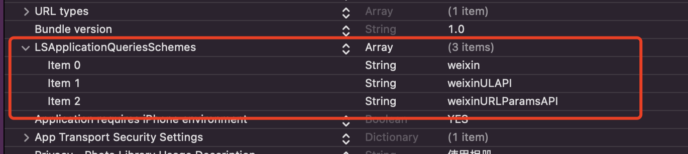 【3】在Xcode中,选择你的工程设置项,选中“TARGETS”一栏,在 “info”标签栏的“LSApplicationQueriesSchemes“添加weixin、weixinULAPI、weixinURLParamsAPI(如下图所示)。