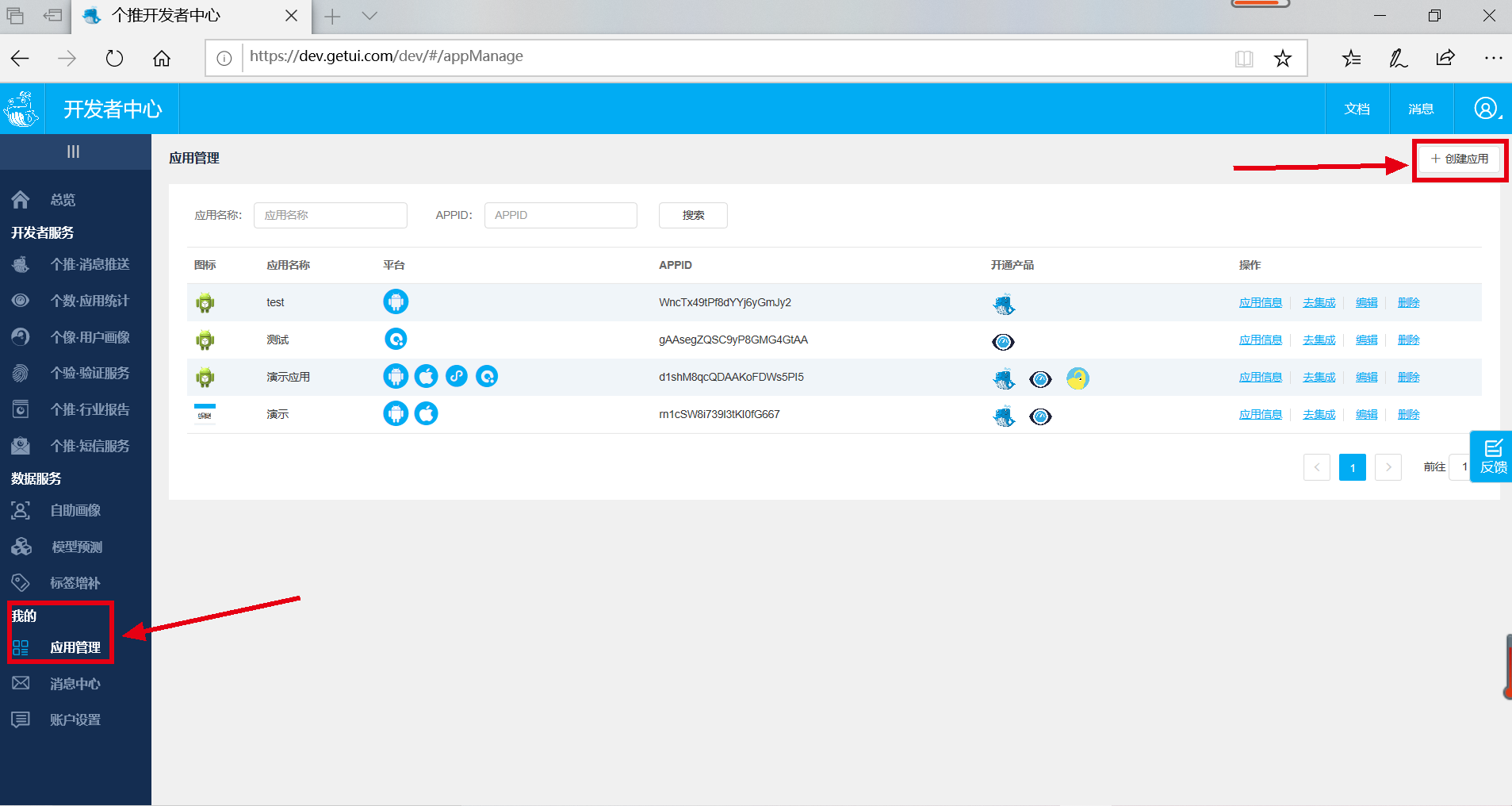 Step 1:登录个推开发者中心,点击【我的】-【应用管理】-【+创建应用】