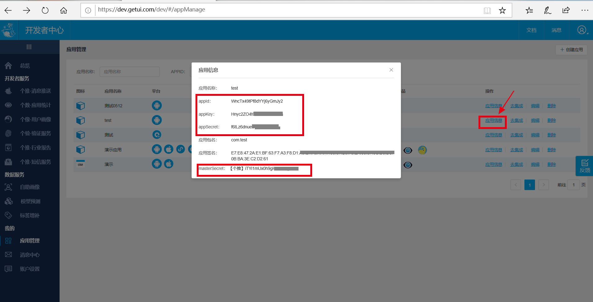 Step 3:查看应用信息,记录appId、appKey、appSecret、masterSecret等信息