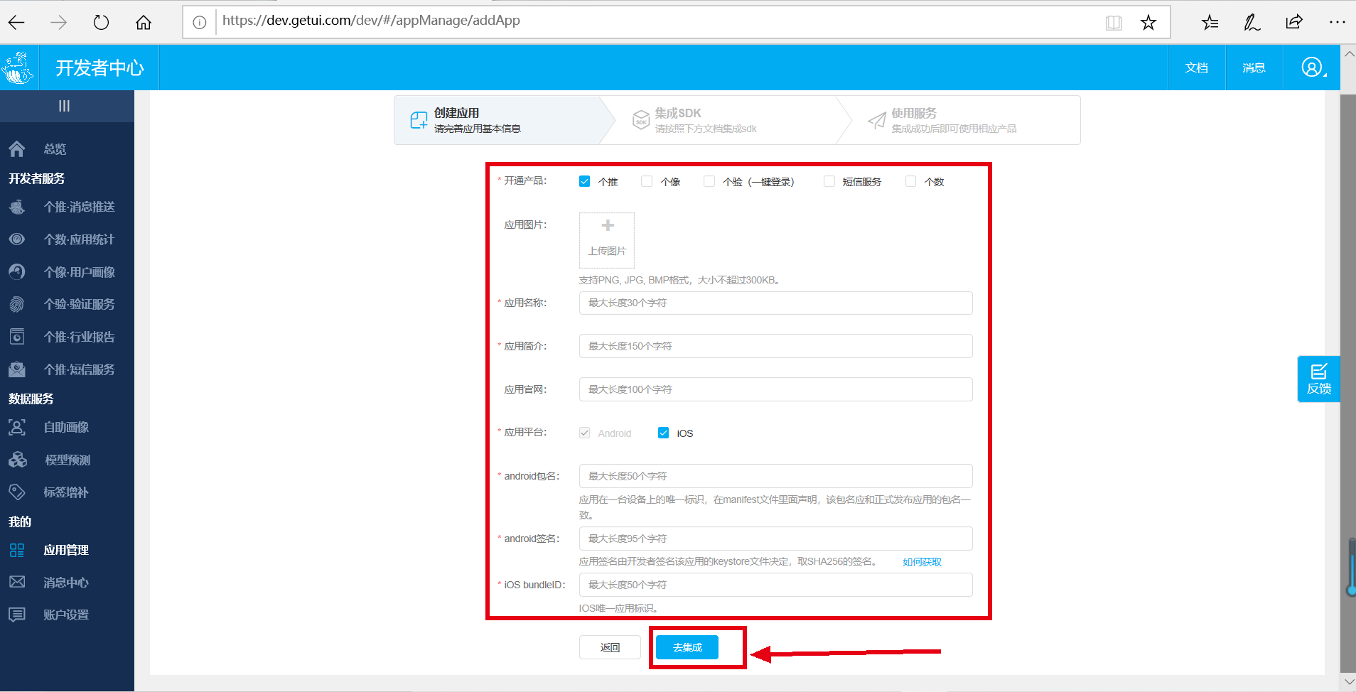 Step 2:选择需开通的个推产品及应用平台,上传应用图片,填写应用名称、简介及android包名、android签名、ios bundleID等信息,点击【去集成】按钮