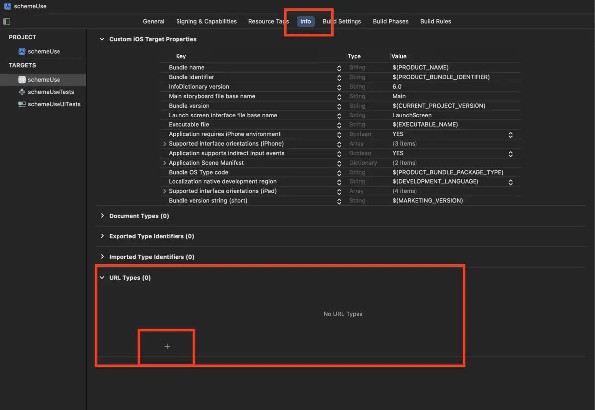 - 打开工程,点击项目名称,找到info条目,在info条目下,找到URL Types