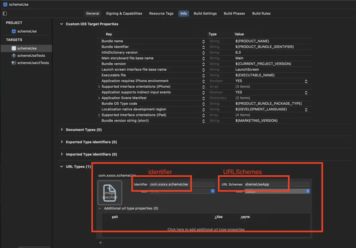 - identifier:URL Identifier是自定义的 URL scheme 的名字,一般采用反转域名的方法保证该名字的唯一性。例如:com.xxxx.schemeUse。