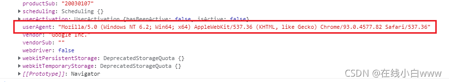 navigator对象有一个属性为userAgent,这是一个只读的字符串,声明了浏览器用于HTTP请求的用户代理头的值。所以我们可以通过判断navigator.userAgent里面是否包含某些值来判断。如下为userAgent的打印值。