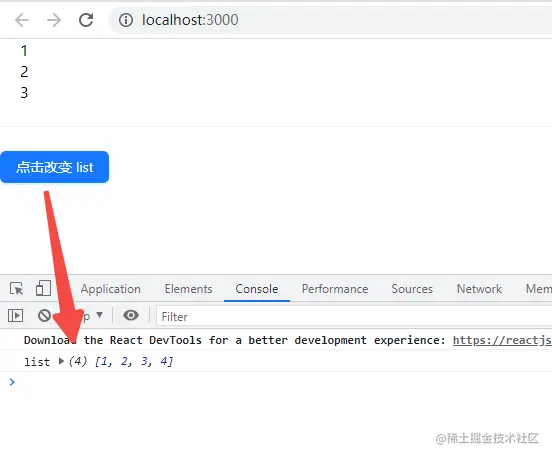 我们可以看见,虽然点击了按钮改变了 list,但此时子组件渲染的只有初始的 1 2 3,并没有重新渲染,这是因为虽然 list 内容改变了,但是 list 是引用类型的数据,memo 对新旧 list 进行浅比较,发现地址没变,就不重新渲染。