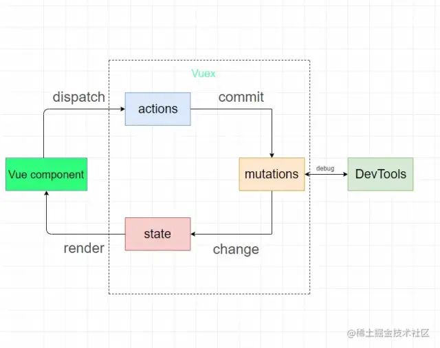 一般来说,vuex中的流程是首先actions一般放异步函数,拿请求后端接口为例,当后端接口返回值的时候,actions中会提交一个mutations中的函数,然后这个函数对vuex中的状态(state)进行一个修改,组件中再渲染这个状态,从而实现整个数据流程都在vuex内部进行便于检测。直接看图,一目了然