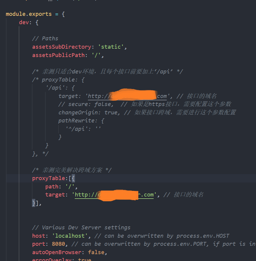如果是前后端分离的项目,本地开发环境需要访问接口,或者在调试时直接访问线上的接口,这时候就会有接口跨域的问题(生产环境不存在跨域问题)。以vue-cli生成的项目为例,需要配置 config/index.js 中的 proxyTable 属性。